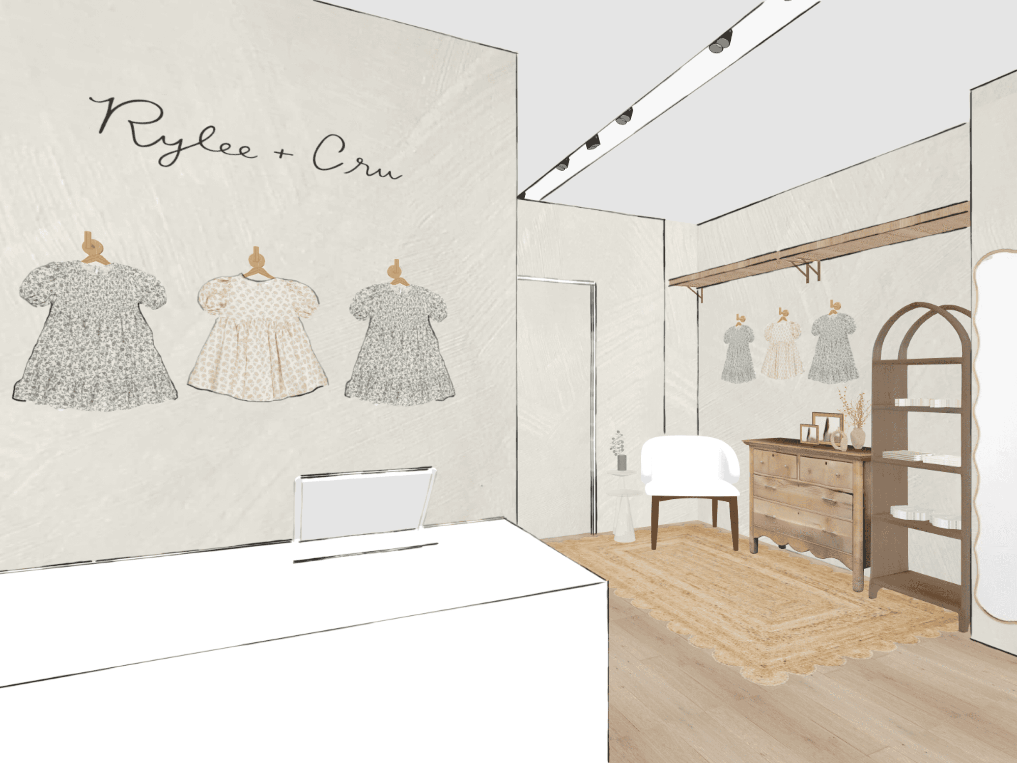 Designed a retail space for Rylee + Cru that feels soft, intimate, and quietly expressive - drawing from the brand’s roots in art and childhood nostalgia. Through custom fixtures, layered materials, and subtle moments of discovery, the space invites a slower, more emotional retail experience.